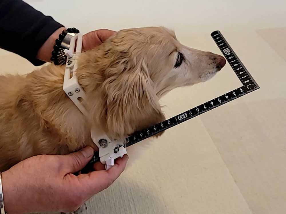 お座りした状態や伏せの状態ではなく、正確な数値が測れる 正しい立位 を保てているかをプロの目でチェックします。